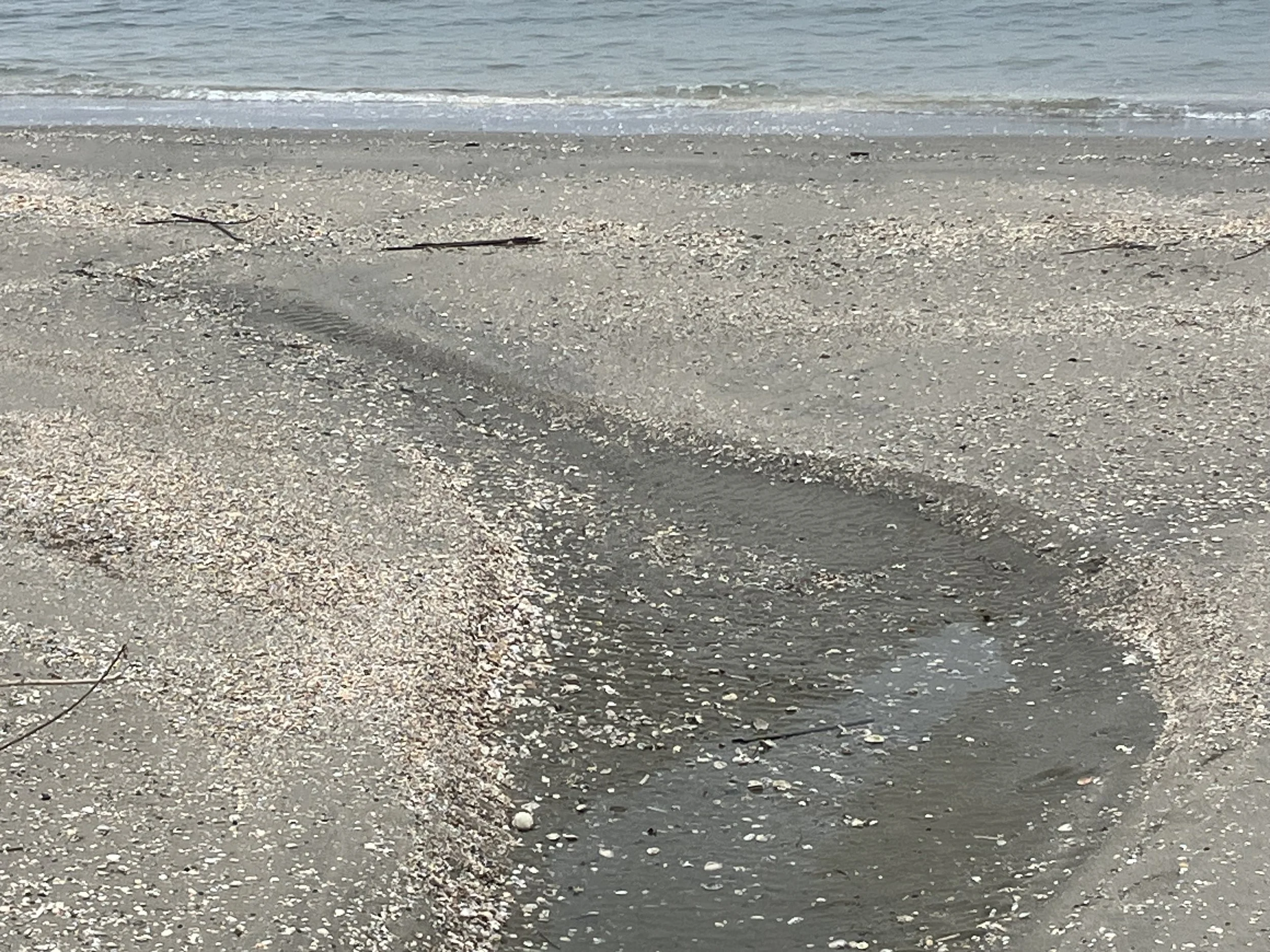 White egret, turtles, sea hawks, purple shells, small silver fish jumping out of the water.